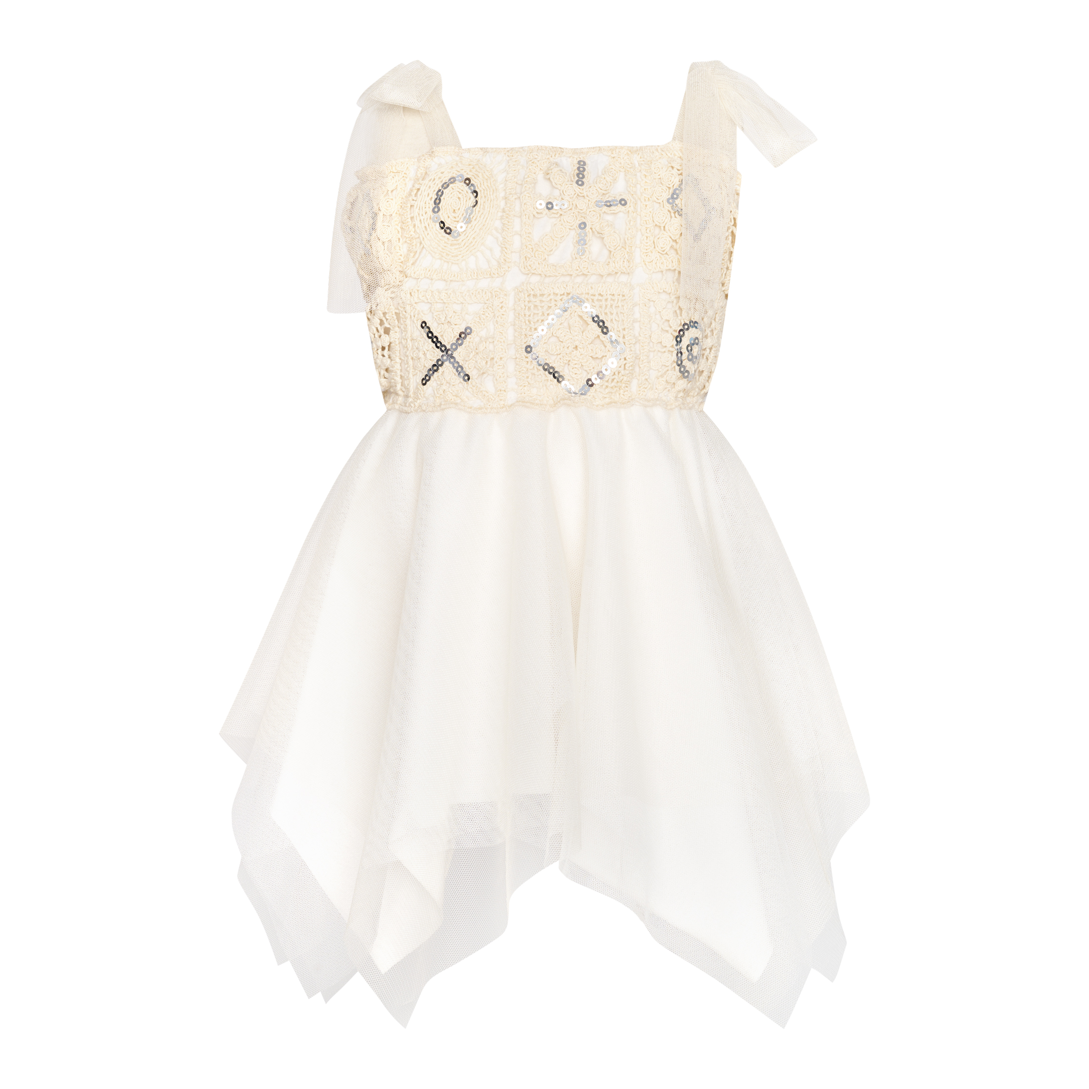 Designed in a soft beige tone, each piece is fully embroidered and enriched with delicate silver details that add a subtle shimmer and sophisticated charm. Clean lines, fine craftsmanship, and airy textures come together to create an effortlessly elegant look, ideal for summer christenings and romantic celebrations.