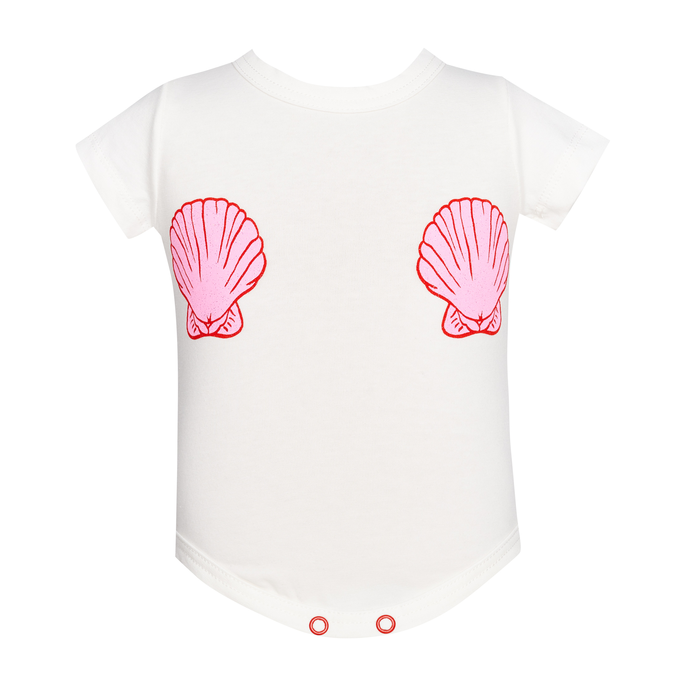 For babies (3–18 months), the collection includes a set of baby bodysuits in delicate white and pink tones—one with long sleeves and one with short sleeves—along with a white baby playsuit featuring shell prints, offering comfort, softness, and adorable everyday style.