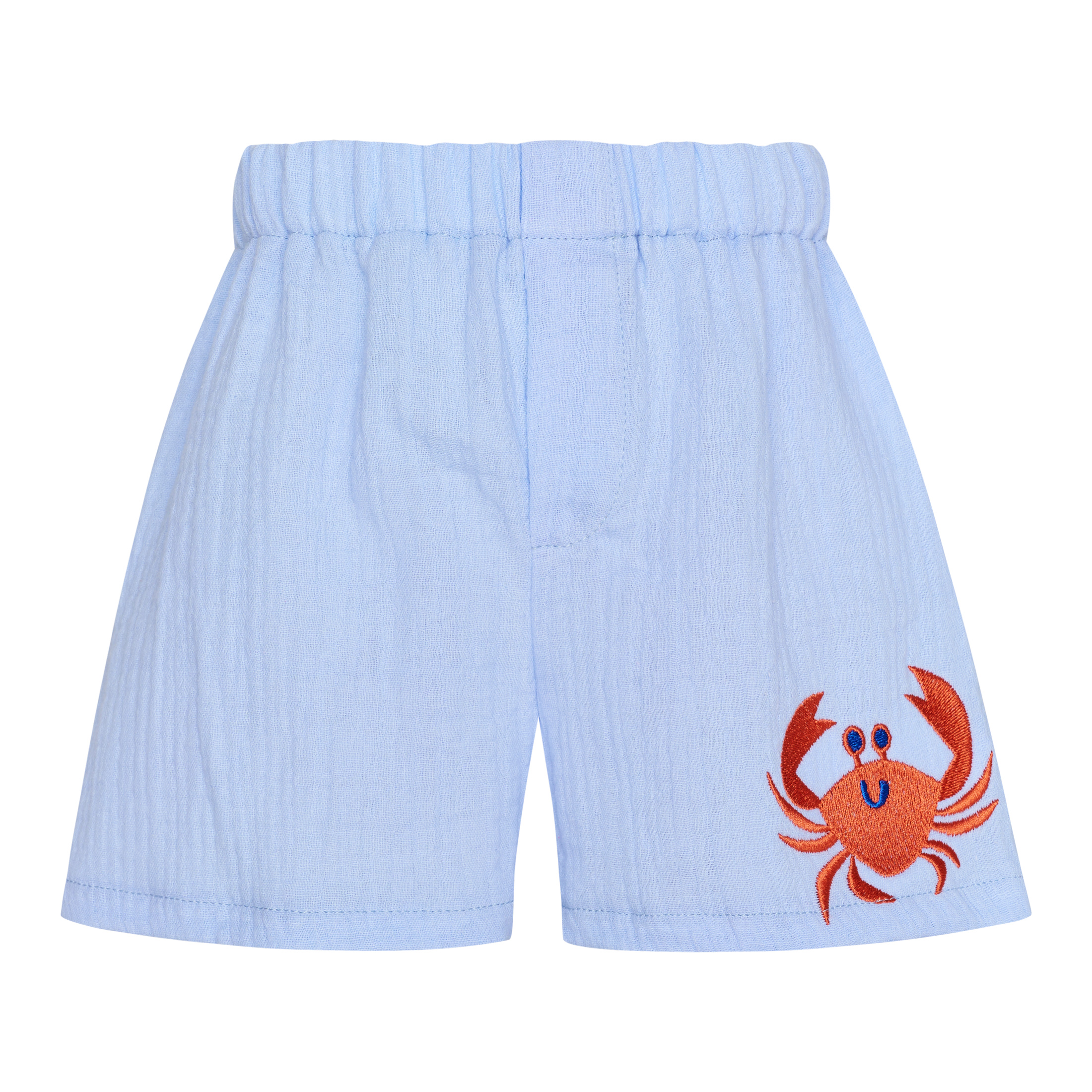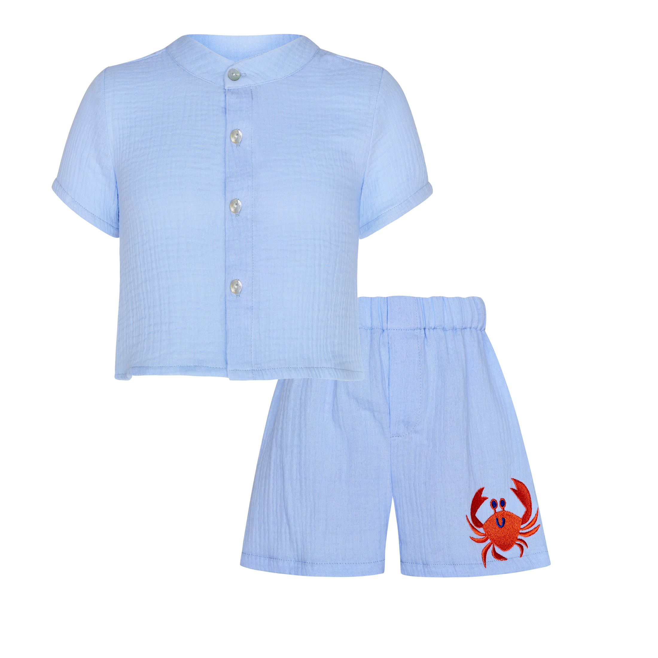 Playful, refined, and inspired by seaside charm, the Crab King Collection brings a fresh summer character to boyswear. Designed in a soft light blue shade, the collection is highlighted by a sweet orange crab embroidery, adding a joyful and distinctive touch.