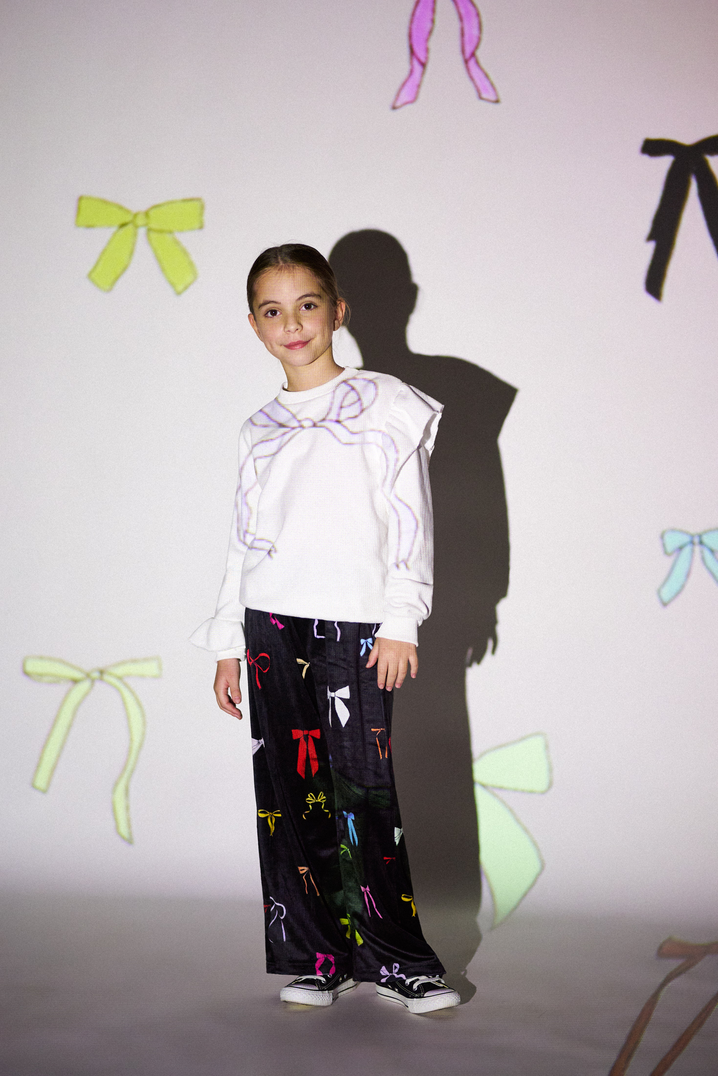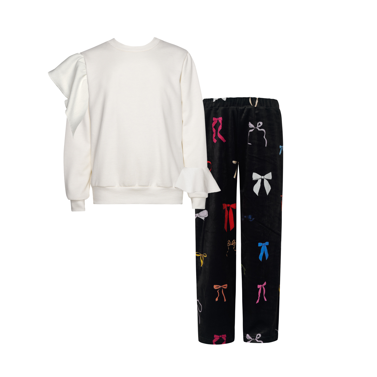 Create a stylish and comfortable look with this Bowland set! Featuring ruffle details on the sleeves and velvet pants with an all-over colorful bow print, it offers a soft and striking appearance. Perfect for the Fall-Winter season!