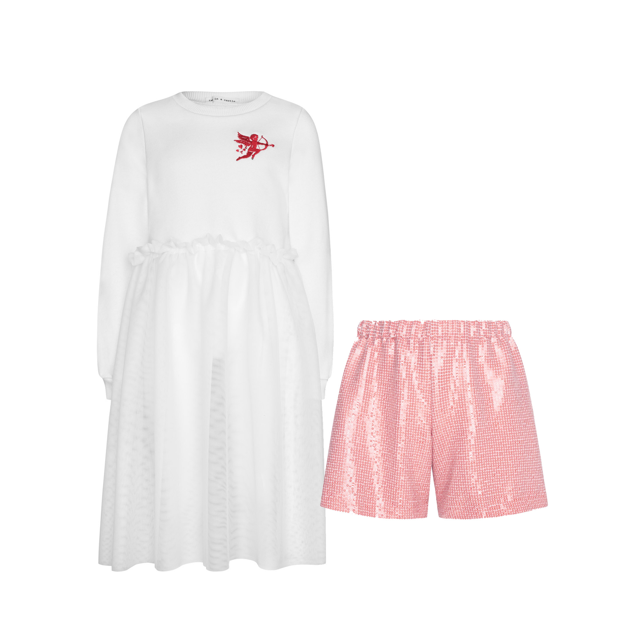 The airy tulle dress pairs beautifully with sparkling sequin shorts, creating a standout look that no one will miss. Perfect for stylish occasions that call for extra charm!
